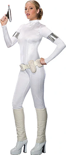 White Battle Jumpsuit w/attached Boot TopsMatching BeltBlaster (Requires 2 ”AA” batteries – not included)Turn Senator Amidala into a fiery vixen with this Amidala Adult One Piece Costume. This sexy Star Wars costume comes in a one-piece, shape revealing white jumpsuit. The jumpsuit zips in the back for easy on and off. In addition, the costume includes attached boot covers and belt with blaster. Help protect democracy with this Amidala Adult One Piece Costume.