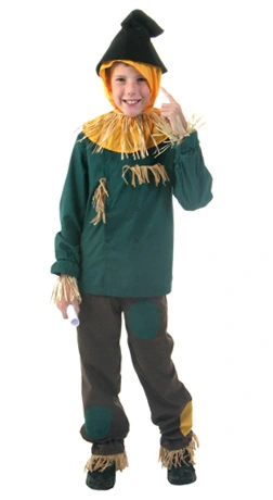 Scarecrow Shirt w/FringePants w/FringeHatThis kids scarecrow costume is a unique Halloween costume from the Wizard of Oz. This costume comes with a green shirt that has snap closures at the shoulders and down the front, as well as fringe accents. The black pointy hat has a 18″ circumference and an attached gold hood with a face opening. The brown pants have an elastic waist as well as elastic at the ankles for added detail. The pants also have circular patches accents. Add scarecrow face makeup for a detailed costume this Halloween!