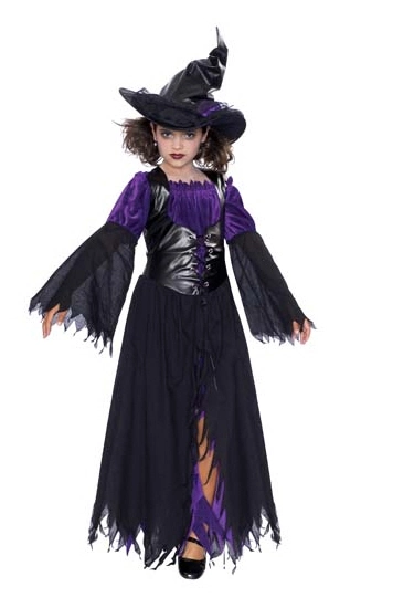 Costume includes: Purple drop sleeve gown, tie up vest with overskirt and matching witch hat.