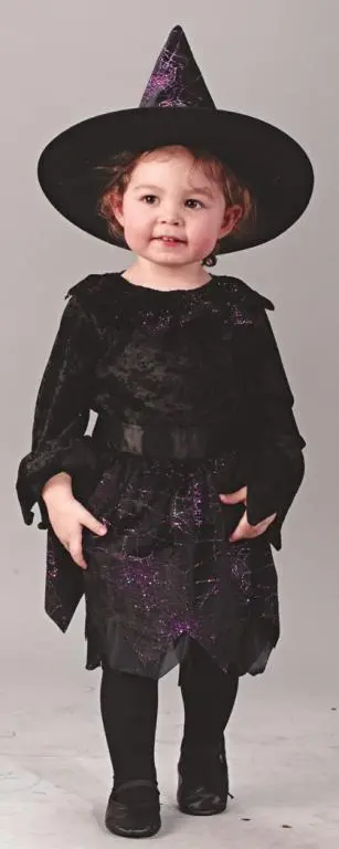 A Glamourous Little Witch!Costume includes: Velvet dress with glitter spiderweb pattern, hat and belt. New glitter-chip details!Available size: